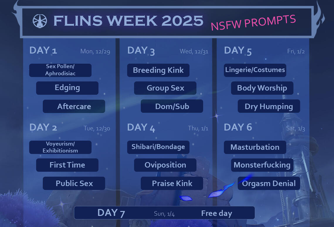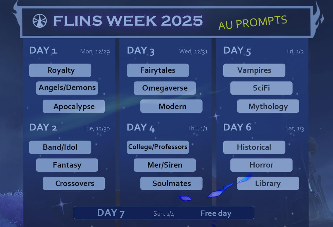 The hashtags are #FlinsWeek2025 & #Flinsweek2025NSFW.If you use the appropriate tags and we don’t repost within 24hrs, please feel free to tag the account directly or send us a DM! We don’t want to miss anyone.All NSFW content must use the #FlinsWeek2025NSFW hashtag.3.NSFW content must be tagged appropriately and sensitive content must be marked as such before posting.4.Fics can be shared in the official FlinsWeek2025 AO3 collection. This will be a moderated collection, mostly to make sure that nothing slips in accidentally that shouldn’t and to make sure none of the fics break our (very few) rules.5. Fic contributions should be tagged properly. This means using any applicable AO3 warnings as well as tagging for things such as major character death, dark/dead dove content, non-con/cnc, etc.6. Underage content is not allowed. We will not repost it and fics will not be included in the official AO3 collection. We will also not repost non-con art or fics to our socials as we know how triggering that can be for some people. Non-con fic can be submitted to the AO3 collection but it must be tagged as such.7. Absolutely no use of AI is allowed and it will not be reposted.