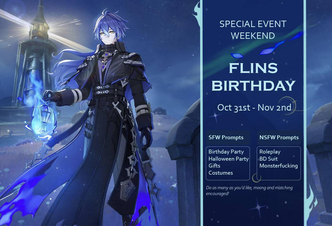 During a fan week you are provided with a selection of prompts to inspire you to create around a theme, character or ship, here the whole week is focus on Genshin Impact character Flins. You can chose to have him solo or along side other characters.2. What content is allowed?