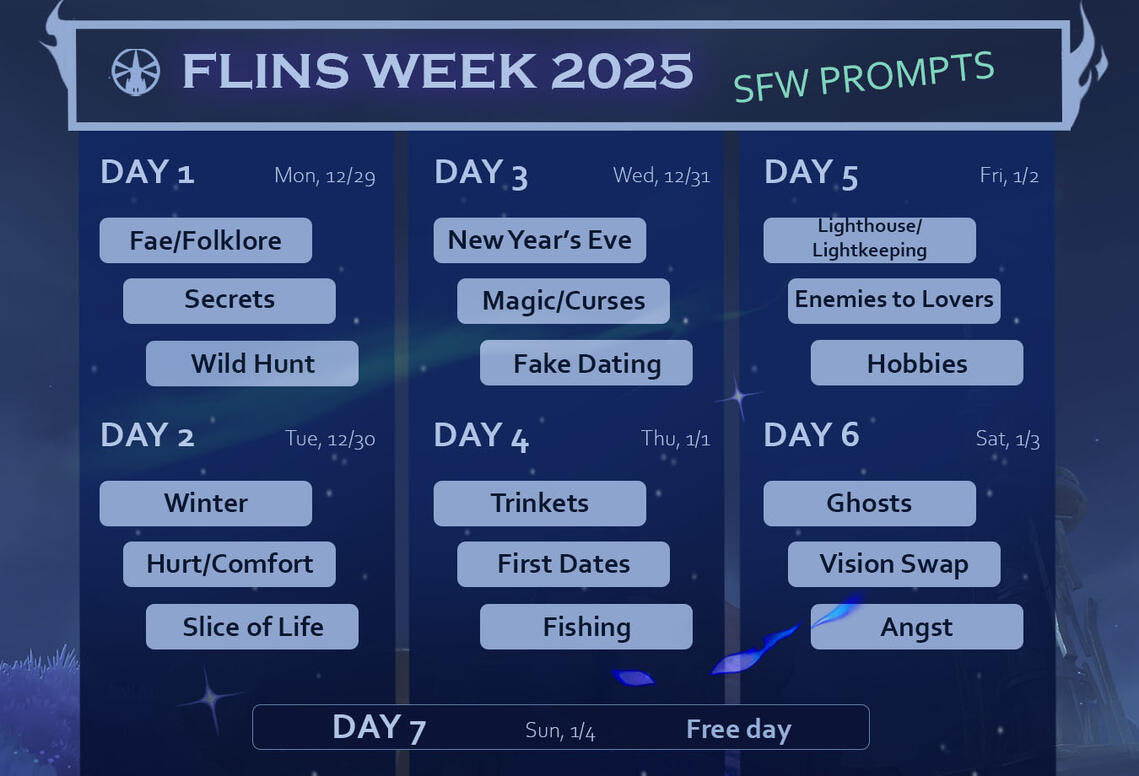 The hashtags are #FlinsWeek2025 & #Flinsweek2025NSFW.If you use the appropriate tags and we don’t repost within 24hrs, please feel free to tag the account directly or send us a DM! We don’t want to miss anyone.All NSFW content must use the #FlinsWeek2025NSFW hashtag.3.NSFW content must be tagged appropriately and sensitive content must be marked as such before posting.4.Fics can be shared in the official FlinsWeek2025 AO3 collection. This will be a moderated collection, mostly to make sure that nothing slips in accidentally that shouldn’t and to make sure none of the fics break our (very few) rules.5. Fic contributions should be tagged properly. This means using any applicable AO3 warnings as well as tagging for things such as major character death, dark/dead dove content, non-con/cnc, etc.6. Underage content is not allowed. We will not repost it and fics will not be included in the official AO3 collection. We will also not repost non-con art or fics to our socials as we know how triggering that can be for some people. Non-con fic can be submitted to the AO3 collection but it must be tagged as such.7. Absolutely no use of AI is allowed and it will not be reposted.